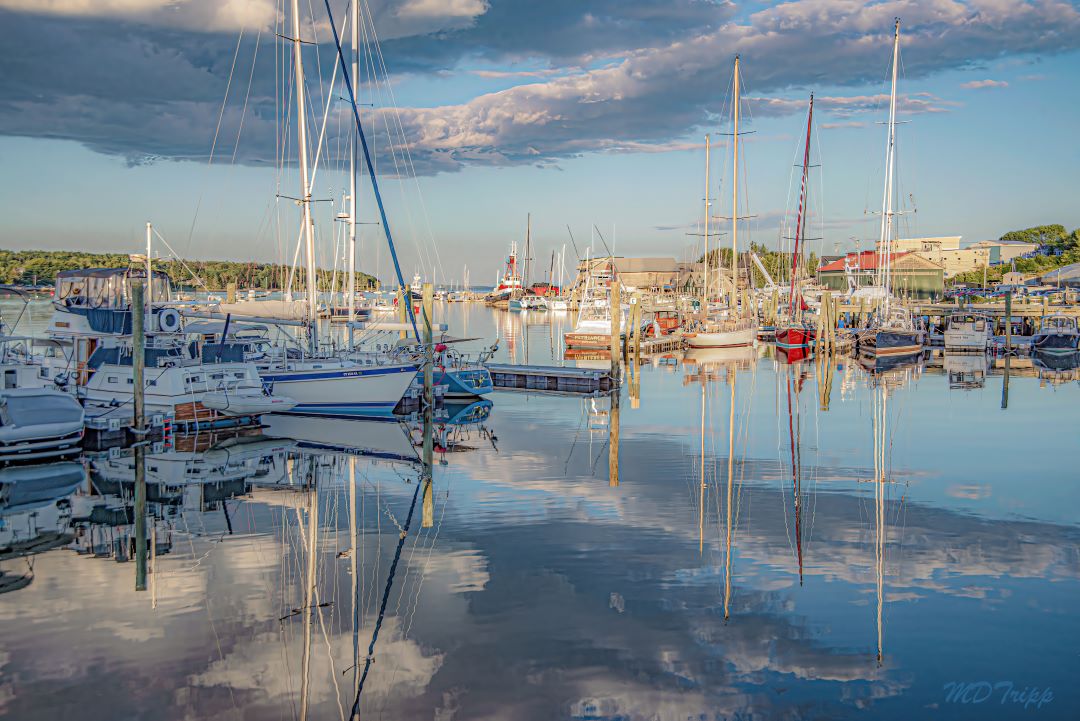 Golden light drapes itself over the harbor, casting a quiet glow on the boats as they sway in the still water. Masts reach toward the sky, their reflections stretching down into the glassy surface below. The air hums with the slow rhythm of a place that knows the tides well—where the day lingers just a little longer, and the water holds onto every last bit of warmth before nightfall.